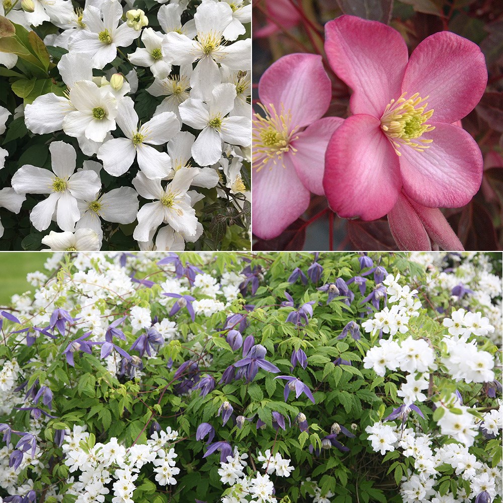 Herald the beginning of the flowering climber season with the Award-Winning Spring Flowering Clematis Collection. Bursting into life from early to late spring, this trio offers a stunning mix of soft blue, pure white, and vibrant cherry pink flowers to brighten walls, fences, and pergolas. These reliable, vigorous climbers thrive in shady spots, making them perfect for north or east-facing gardens.