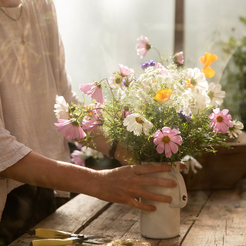 An exquisite cottage garden inspired cut flower collection, curated for the discerning gardener and florist using pink, white, and orange, easy to grow annuals.